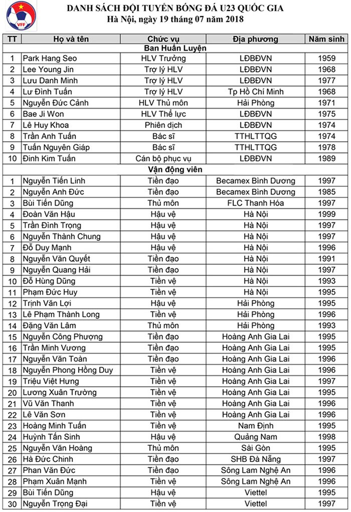 Dự kiến ngay sau khi giải Bóng đá Quốc tế - Cúp VinaPhone 2018 kết thúc vào ngày 7/8, ông Park Hang Seo sẽ chính thức chốt lại danh sách cuối cùng 20 cầu thủ U23 và 3 cầu thủ trên 23 tuổi, chuẩn bị cho cuộc tranh tài được dự báo rất khó khăn tại ASIAD 18.