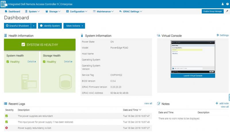 Về mặt giám sát, iDRAC có bảng điều khiển cơ bản cung cấp số liệu thống kê. Điều này thường có thể được sử dụng như một kiểm tra vệ sinh.