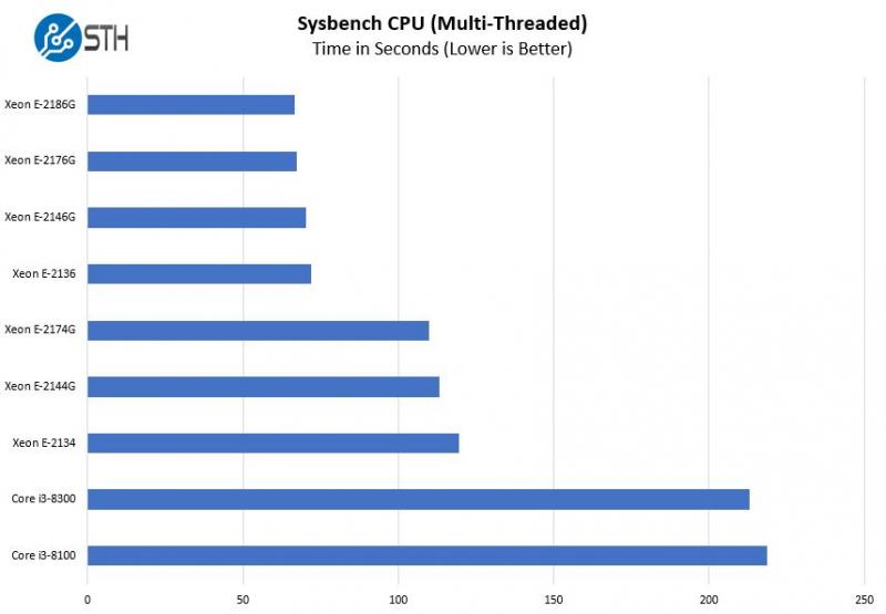 Sysbench làm nổi bật đồng bằng này với sự cải thiện hiệu năng gần như gấp 3 lần của sáu lõi, mười hai luồng Intel Xeon E-2136 so với Intel Core i3-8100 .