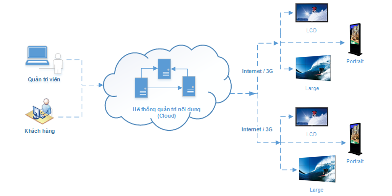 Khách hàng cài đặt và kích hoạt phần mềm trên hệ thống box Android cho phép hiển thị quảng cáo/hình ảnh trên các thiết bị hiển thị. Đối tượng khách hàng của dịch vụ này là đơn vị có mạng lưới các màn mình LCD, LED… được lắp đặt tại các tòa nhà cao ốc, siêu thị, nhà ga, bệnh viện… sử dụng dịch vụ để phát các nội dung quảng cáo.