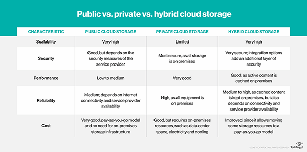 Mặc dù lưu trữ đám mây công cộng cung cấp mức độ mở rộng cao và không yêu cầu cơ sở hạ tầng lưu trữ tại chỗ, hiệu suất và bảo mật có thể khác nhau rất nhiều giữa các nhà cung cấp dịch vụ. Ngoài ra, độ tin cậy, không giống như lưu trữ đám mây riêng, nằm trong khả năng kết nối internet và nhà cung cấp dịch vụ sẵn có. Tuy nhiên, nó cung cấp một mô hình trả tiền khi bạn đi, vì vậy người dùng chỉ trả tiền cho dung lượng lưu trữ mà họ cần. Mặc dù các đám mây công cộng là đáng tin cậy, đã có những sự cố được công bố rộng rãi về việc chúng đi xuống hoặc vi phạm dữ liệu thường do lỗi của người dùng. Và các đám mây công cộng nhỏ hơn có nguy cơ ra khỏi doanh nghiệp, khiến khách hàng của họ chịu trách nhiệm di chuyển dữ liệu của họ khỏi cơ sở hạ tầng của nhà cung cấp đám mây thất bại.