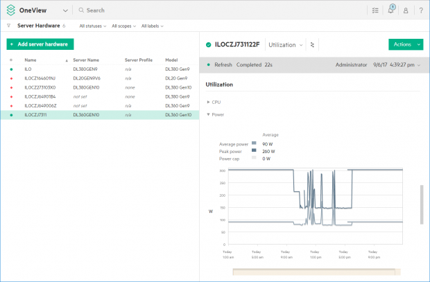Với ứng dụng OneView đã được ảo hoá của phòng thí nghiệm cập nhật lên v3.1, HPE đã thêm DL360 Gen10 làm một phần tử được theo dõi mới. OneView là miễn phí nếu bạn chỉ sử dụng nó để theo dõi máy chủ và môi trường lưu trữ của bạn và cung cấp nhiều thông tin về CPU, điện và nhiệt độ, cộng với các công cụ điều khiển điện và chạy các phiên điều khiển từ xa.