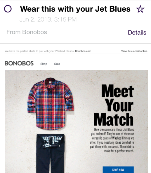 Hoặc khi biết được lịch sử mua sắm của khách hàng, bạn có thể dễ dàng cung cấp hoặc bán các sản phẩm liên quan, sản phẩm đi kèm. Giống như cách mà Bonobos đã đề xuất thêm chiếc áo đi kèm với chiếc quần jeans mà tôi vừa mua từ họ:
