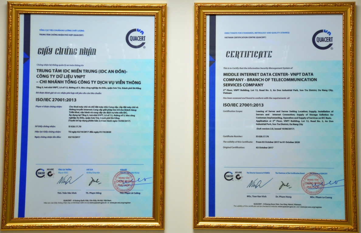 Chứng chỉ ISO/IEC 27001:2013 được trao cho Chi nhánh Công ty Dữ liệu VNPT tại Miền Trung (Khu Công nghiệp An Đồn, Sơn Trà, Đà Nẵng).