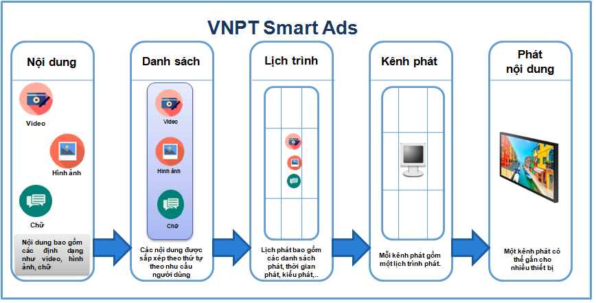 • VNPT SmartAds là dịch vụ truyền tải nội dung từ trung tâm điều khiển đến một hoặc một hệ thống các màn hình hiển thị trong cùng mạng lưới dựa trên nền tảng công nghệ điện toán đám mây. • VNPT SmartAds cho phép người sử dụng dễ dàng quản trị, thay đổi nội dung ở các màn hình hiển thị một cách linh hoạt hoặc theo kế hoạch đã định trước.