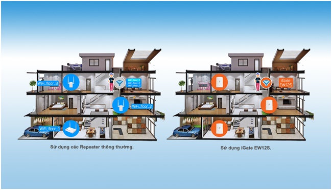 Thiết bị iGate EW12S cho phép thiết lập hệ thống mạng Mesh với nhiều điểm truy cập một cách linh hoạt. Hệ thống trung tâm tự động điều khiển cấu hình các điểm thu – phát khác, có khả năng tự thích nghi với môi trường, tự động điều chỉnh các thông số vô tuyến, điều chỉnh cân bằng tải giữa các thiết bị theo từng luồng. Ngoài ra, hệ thống còn có khả năng tự sửa chữa, khởi tạo kết nối thay thế khi kết nối giữa các điểm thu – phát có vấn đề, cùng cơ chế chuyển vùng thông minh, tự động kết nối vào điểm truy cập tốt nhất tùy theo vào vị trí và trạng thái hiện tại. Ứng dụng điều khiển của thiết bị được thiết kế hiện đại, thân thiện với người sử dụng, dễ dàng thao tác, cài đặt, điều chỉnh. Hiện nay, không gian phủ sóng của một hệ thống với bộ gồm 3 sản phẩm iGate EW12S có diện tích lên đến 600m2, tín hiệu xuyên tầng, không tồn tại điểm chết, thích hợp với các loại kiến trúc như hộ gia đình, quán cafe, nhà hàng với đặc trưng nhiều tầng nhiều phòng, mang lại trải nghiệm sử dụng Internet đáng tin cậy, tốc độ ổn định mọi lúc mọi nơi.