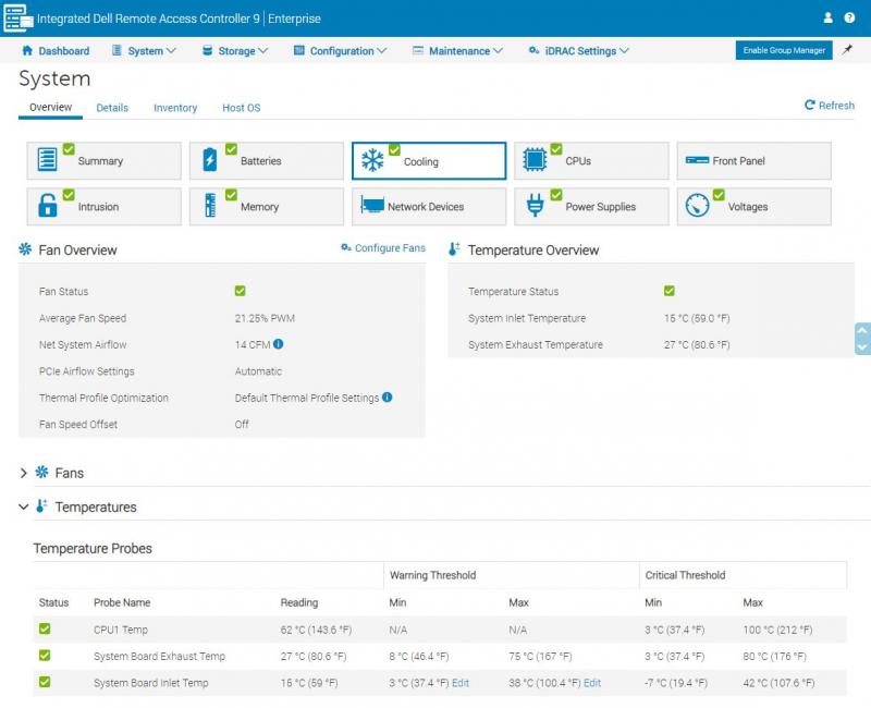 Về mặt giám sát, iDRAC có bảng điều khiển cơ bản cung cấp số liệu thống kê. Điều này thường có thể được sử dụng như một kiểm tra vệ sinh.