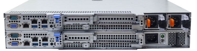 Nhìn vào phía sau khung máy, có các cổng VGA và nối tiếp kế thừa cùng với hai cổng USB 3.0. Một NIC quản lý iDRAC chuyên dụng và các cổng 1GbE kép. Chúng tôi đặt máy PowerEdge R340 trên PowerEdge R240 tại đây.